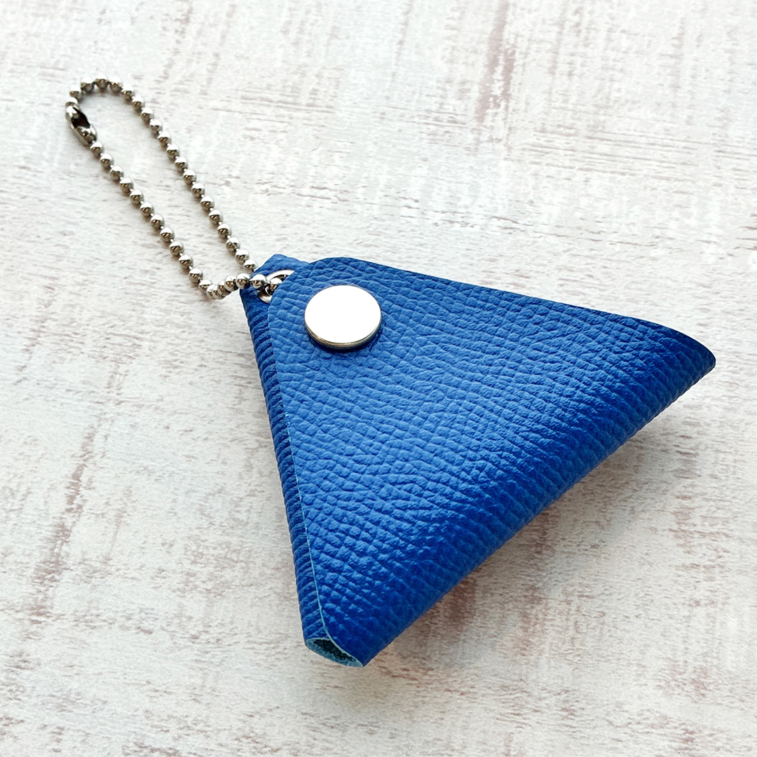 本革を使用した三角形のコインケースです。小銭や小さいレジ袋などが入ります。サイズは1辺約7センチ。