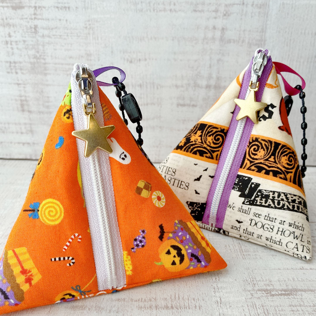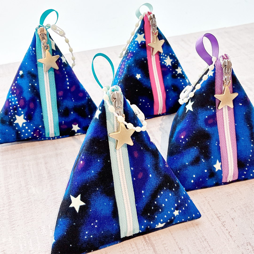 生地の星柄部分と蓄光ボールチェーン、ファスナーが暗闇で光るさんかくポーチです。1辺が約11センチの手のひらサイズ。生地はハロウィン柄と蓄光プリントの星柄2種類からお選び頂けます。