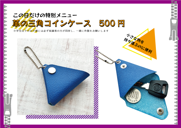 この日は現在WEBに掲載されている体験メニューに加えて革の三角コインケース、光るさんかくポーチが体験可能です。特別メニューに関してご予約による取り置きは行いませんので、売り切れの場合はご容赦くださいませ。他のメニューでもハロウィン柄の生地をご用意しておりますので、ぜひご予約の上遊びにきてくださいね。