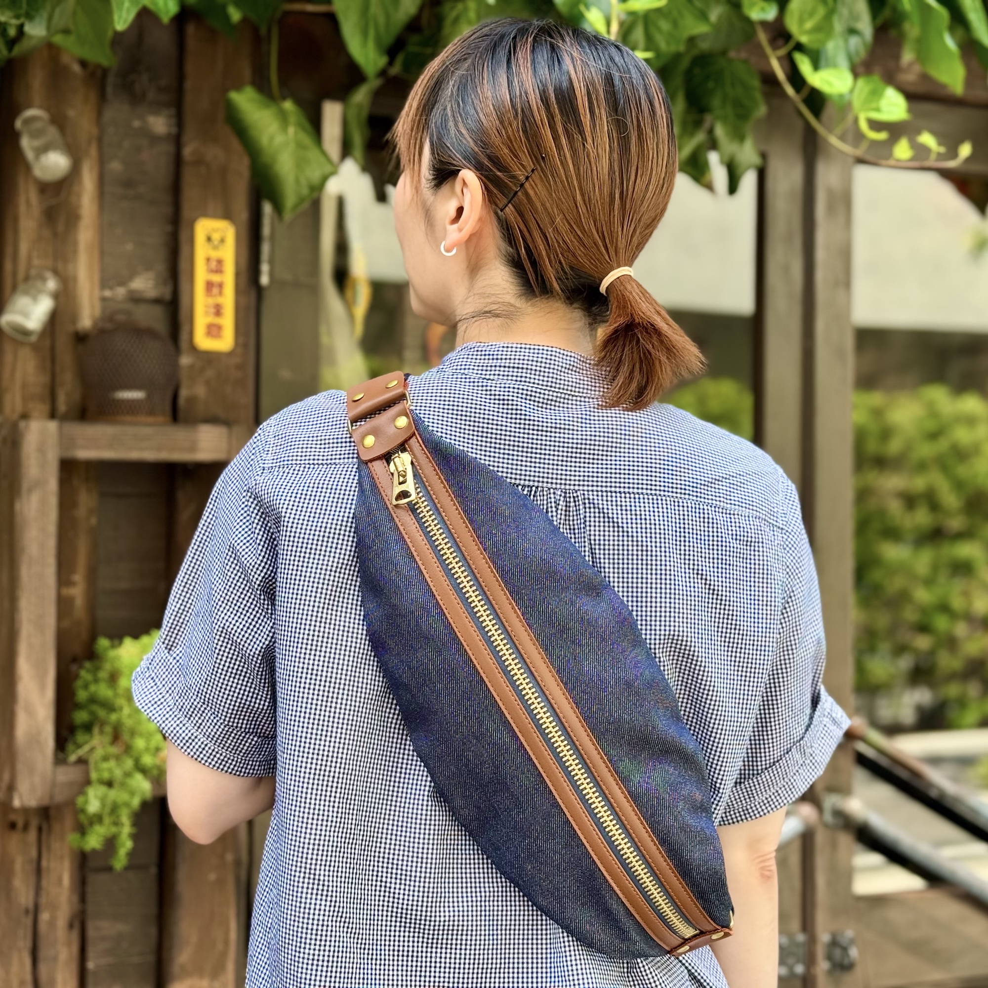 作品は財布とスマホがスッキリ収まるスマートな薄型デザインのボディバッグ。