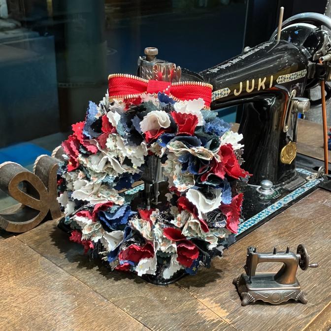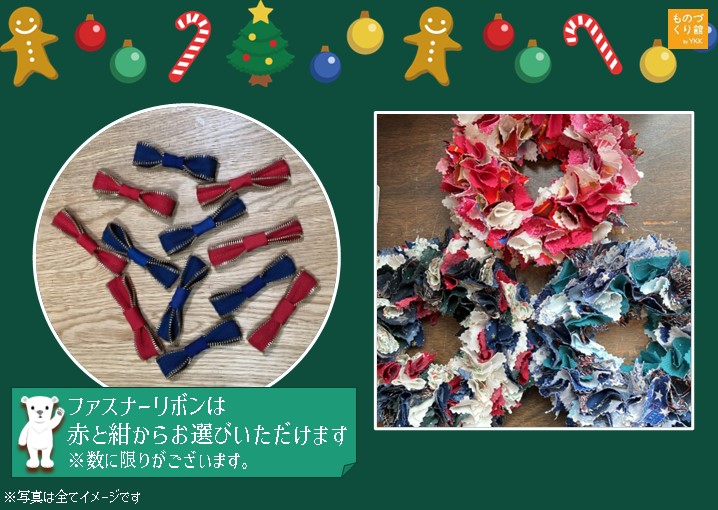 ワークショップ当日は縫製済みのリボンをお渡しいたします。色は赤と紺の2色から当日お好きな色をお選びいただけます(数に限りがございます)。