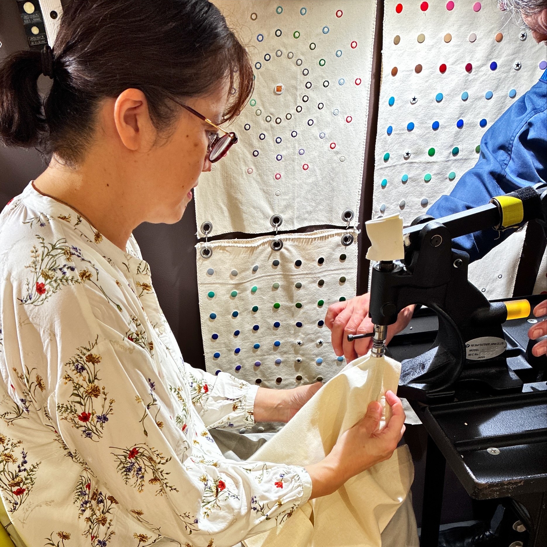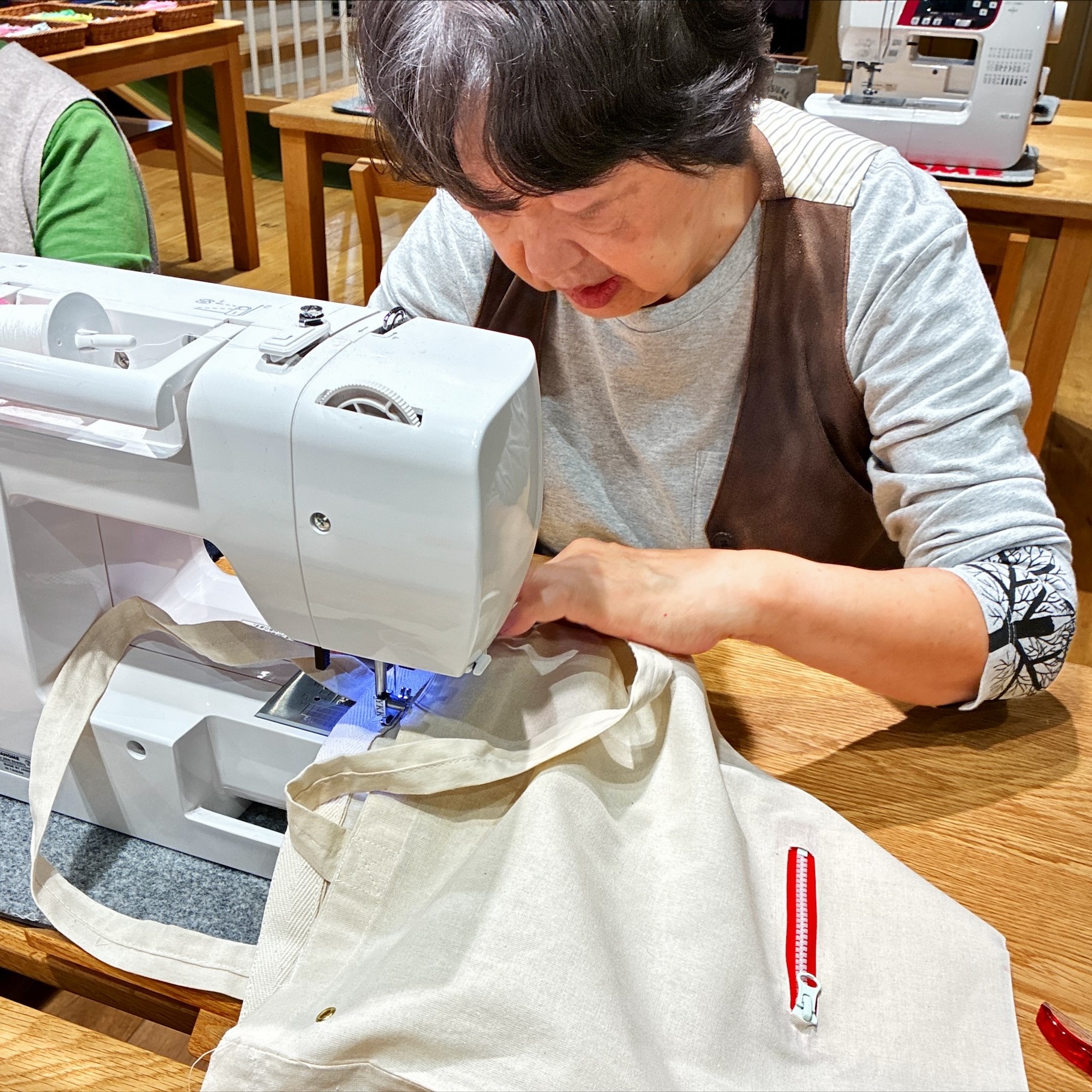 今回は既製品トートバッグに、ハトメを打ち付け、袋口に紐通し部分を縫製、紐をハトメやコードストッパーに通したり、ファスナーポケットを接着してナップサックとしても使えるようにアレンジするワークショップです。