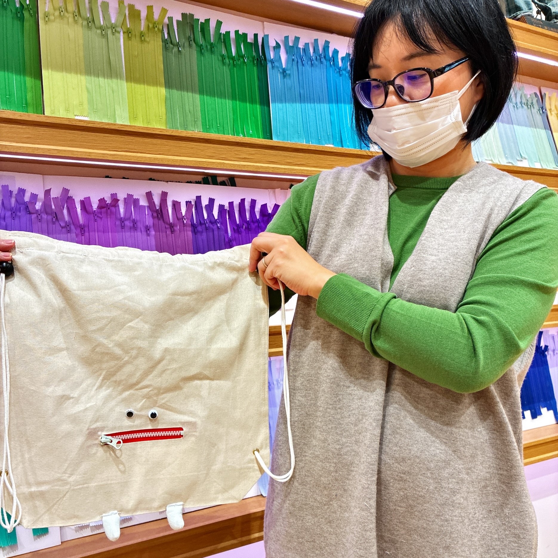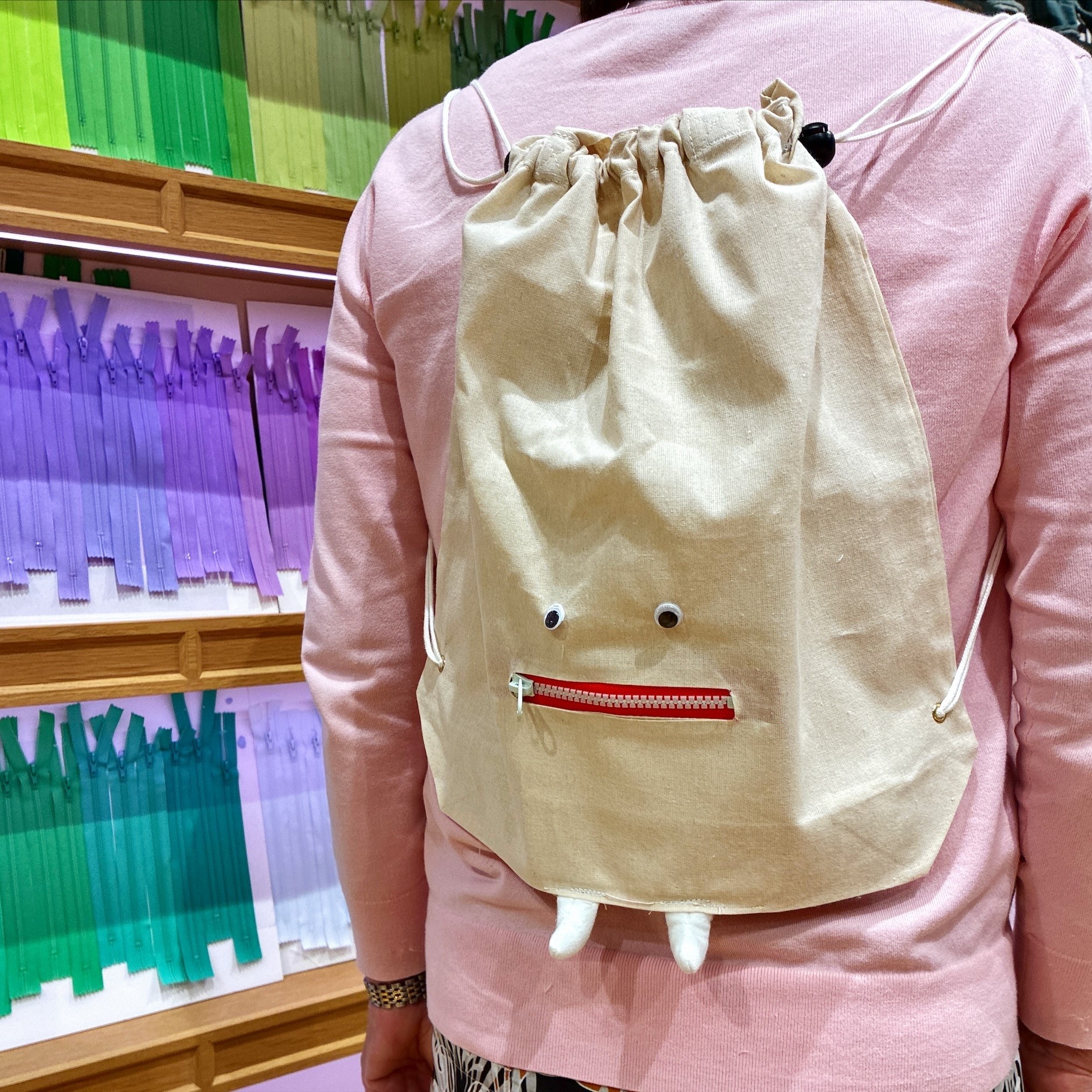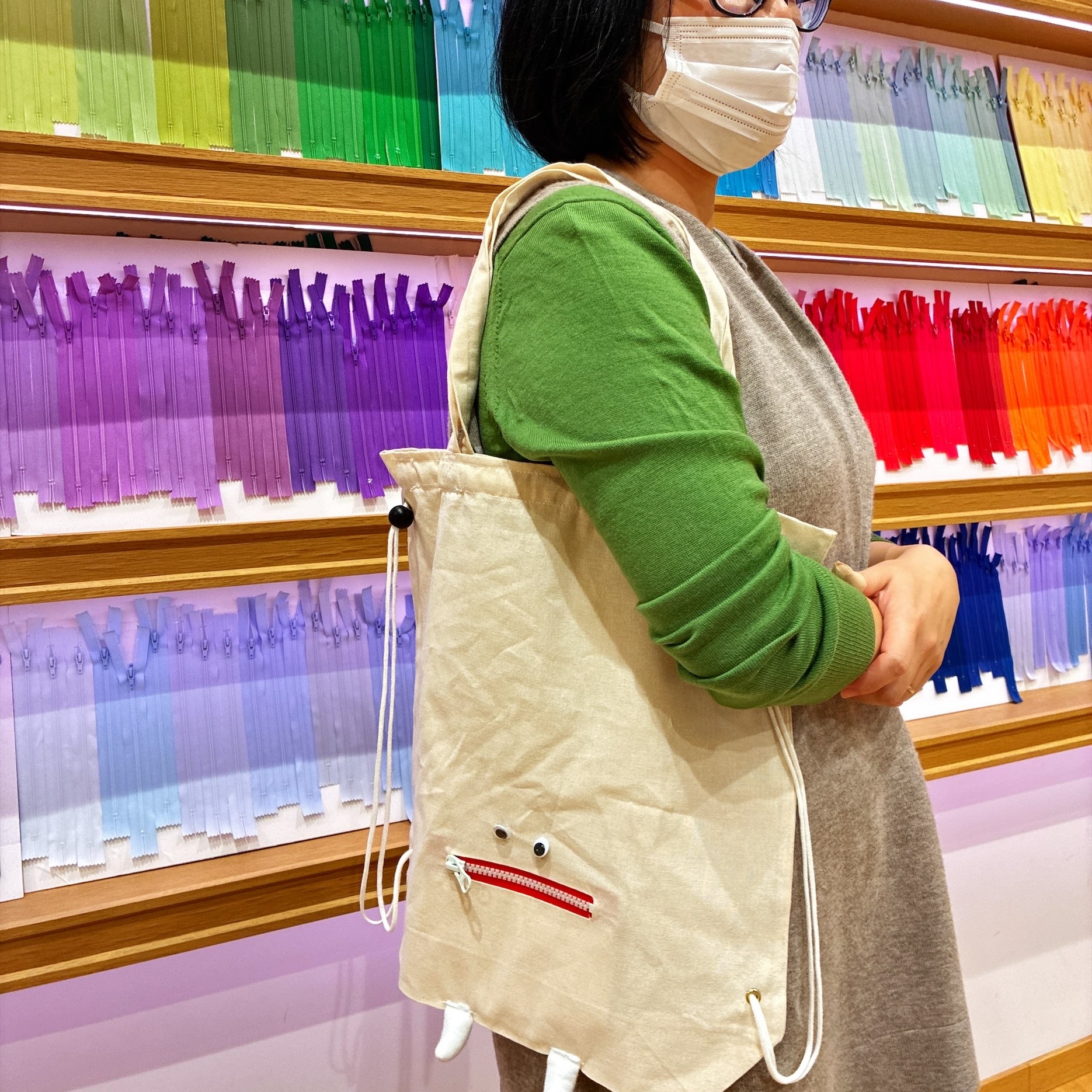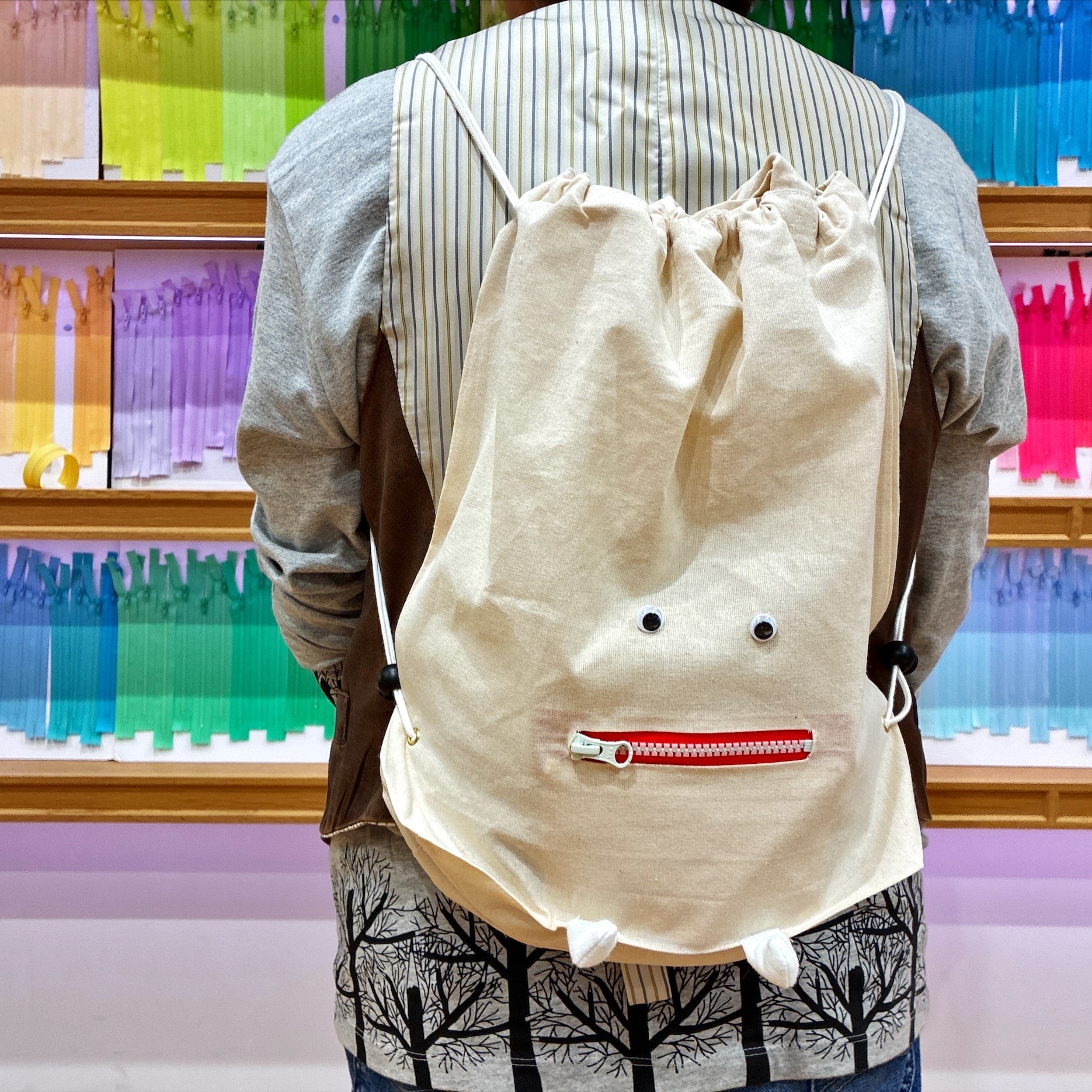 目のパーツと足の位置は自由に決めていただいたのですが、それだけでも個性がでて世界に一つだけの素敵なバッグができあがりました。