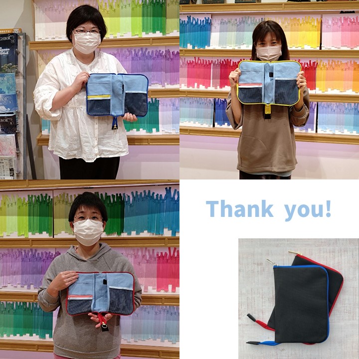 ファスナーチェーンとスライダー、12㎝のコイルファスナーは当日お好きな組み合わせをお選びいただきました。