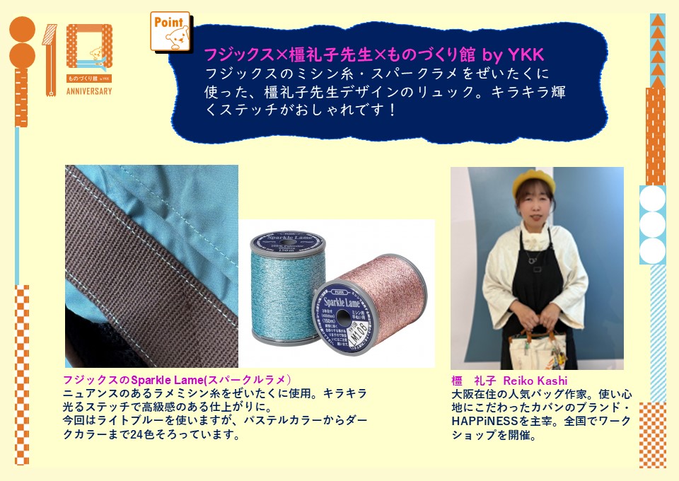 今回の作品はフジックスにご協力いただいたスパークルラメ糸をぜいたくに使用した軽量リュックを大阪在住の人気バッグ作家・橿礼子先生に教えていただきました。