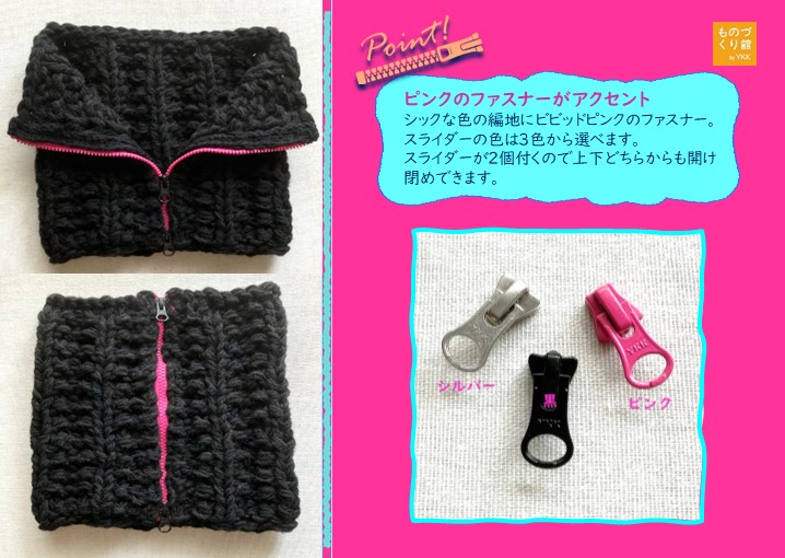 ファスナーはビビッドなピンクのビスロン®を使用。